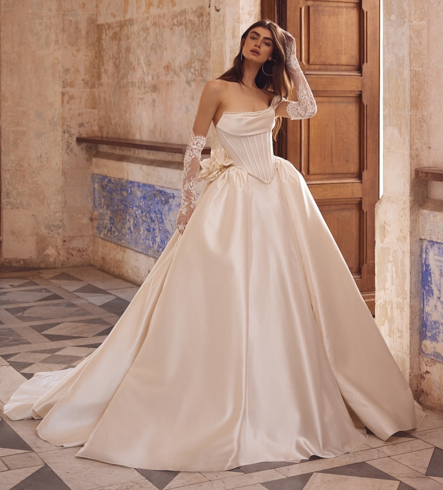 Luxury Drop Waist Lace Overlay Long Wedding Dress with Glove SW096