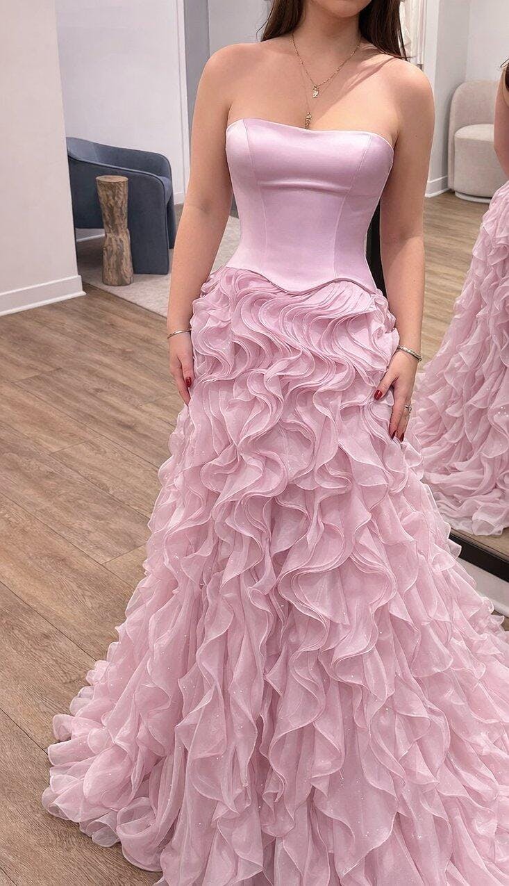 Step into romantic elegance with this pink strapless A-line evening gown, designed to make you feel like the center of attention at prom, weddings, or galas. Its key features include: a structured sweetheart strapless bodice that flatters your décolletage, a voluminous A-line skirt crafted from layers of lightweight, flowy chiffon ruffles for soft, romantic movement.