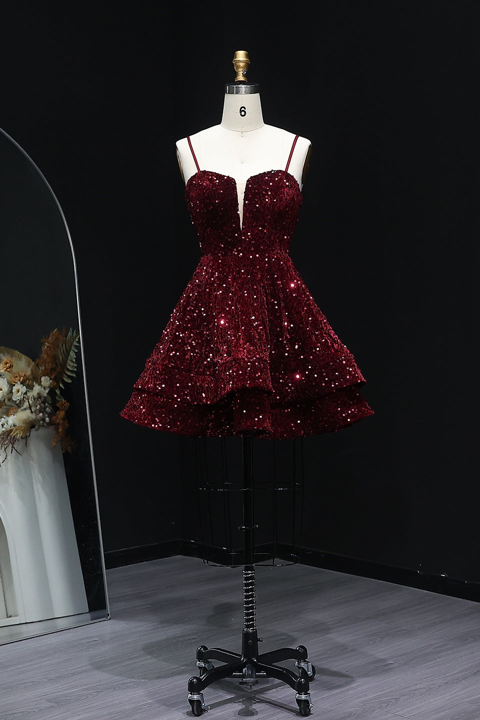 The dress features a romantic sweetheart V-neck (with delicate spaghetti straps), a figure-hugging bodice covered in dense sequins, and a voluminous layered tiered mini skirt that sways with every move. The rich burgundy hue pairs with nonstop shimmer to turn heads, while the corset back ensures a tailored, comfortable fit.