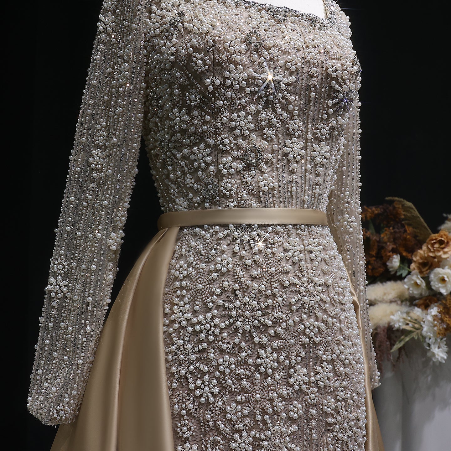 This gown features a sophisticated square neckline, elegant long sleeves, and a flowing A-line silhouette that flatters every figure. The meticulous beaded detailing on the bodice adds a touch of opulence, while the floor-length cut ensures a regal presence.