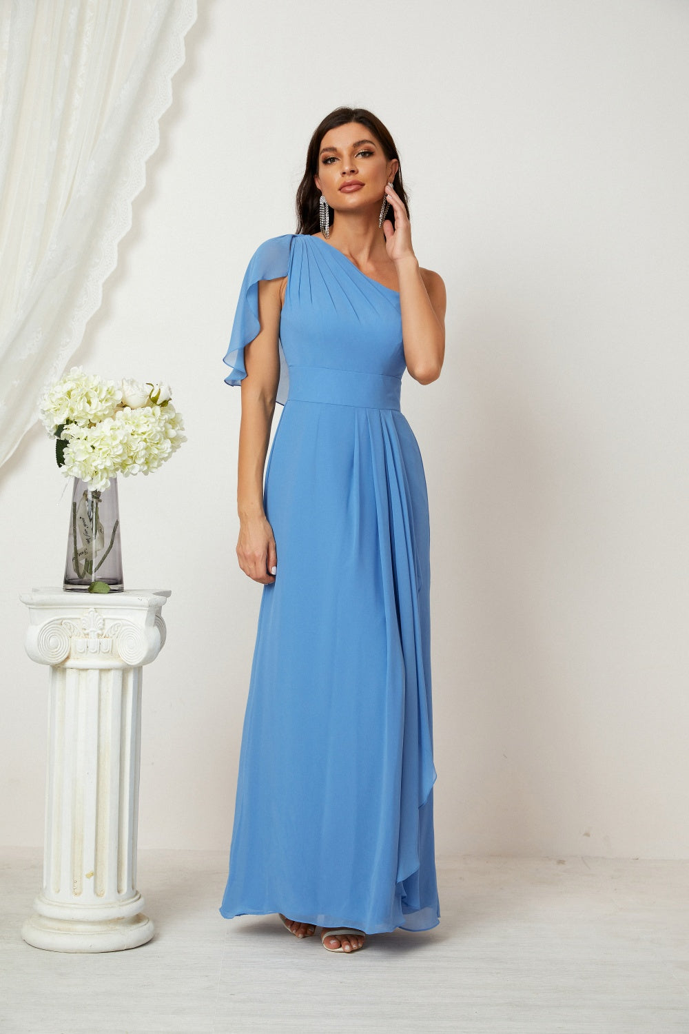 Crafted from airy chiffon, this dress features a chic one-shoulder neckline with an elegant ruffled short sleeve, a flowing A-line silhouette, and a floor-length cut that exudes timeless grace. Perfect for weddings, formal events, or any special occasion.