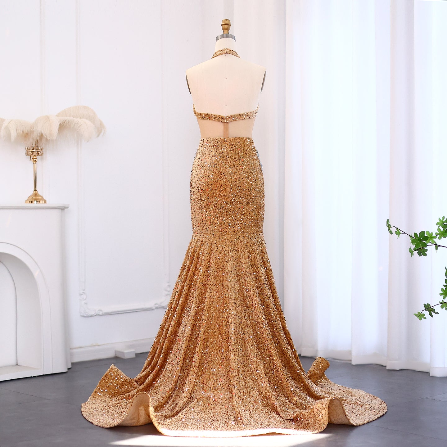 Classic Gold Rhinestone Halter Mermaid Evening Prom Dress SH006