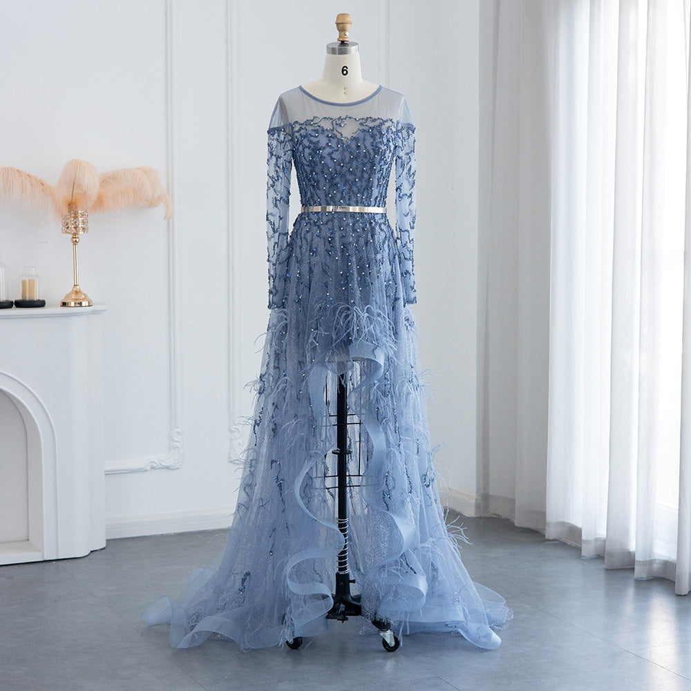 Dubai Blue Feathers High Low Evening Dress for Wedding Party SS111L