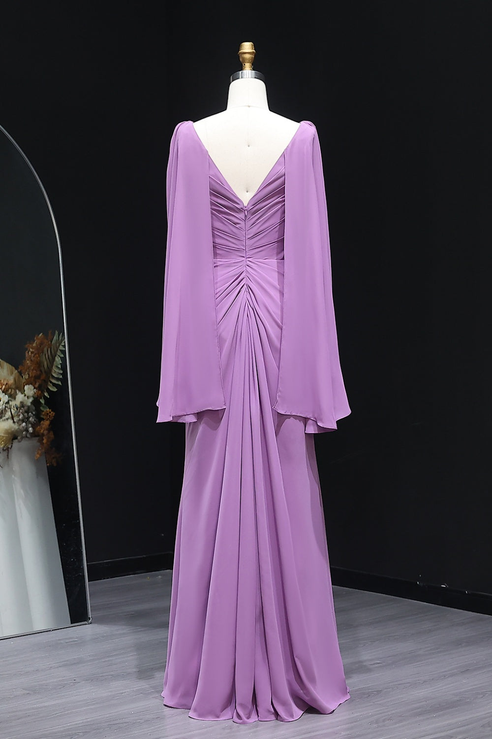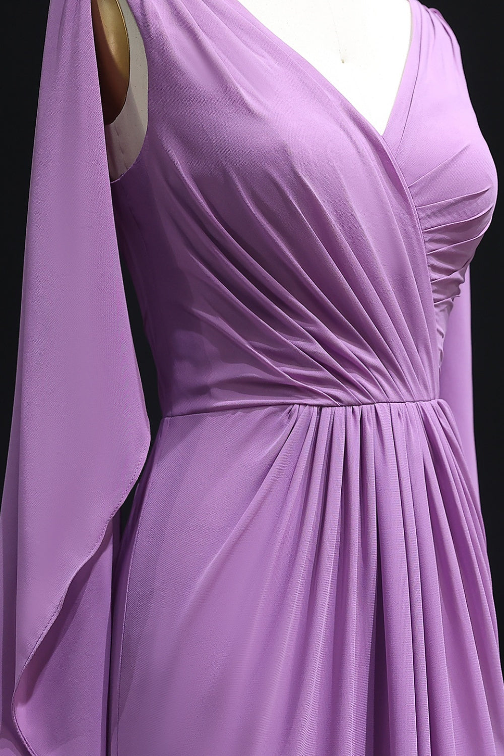 Elevate your bridal party’s elegance with this Lilac V-Neck Chiffon A-Line Bridesmaid Dress. Crafted from airy chiffon, this dress features a flattering V-neckline, dramatic draped long sleeves, and a flowing A-line silhouette with elegant draped detailing at the waist.