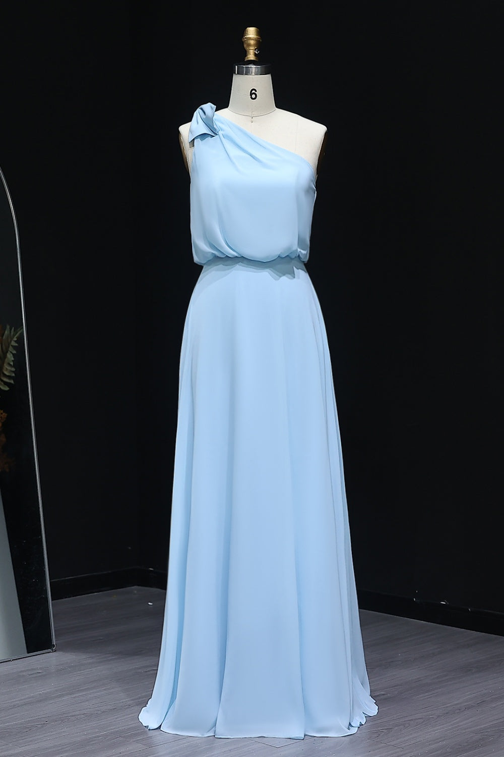 Add a touch of whimsy to your bridal party with this Light Blue One-Shoulder Chiffon A-Line Bridesmaid Dress. Crafted from airy chiffon, this dress features a chic one-shoulder neckline with a charming bow detail, a flowing A-line silhouette, and a floor-length cut that exudes effortless elegance.