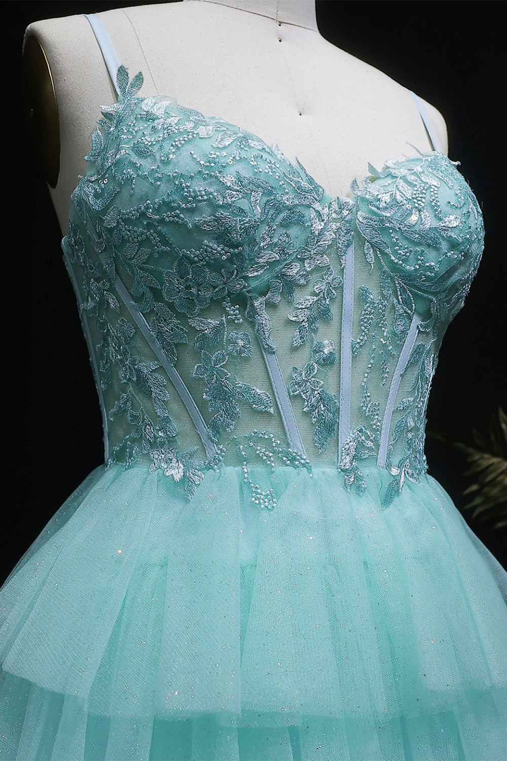 Mint Green Tiered Tulle Homecoming Dress with Lace Bodice RM141