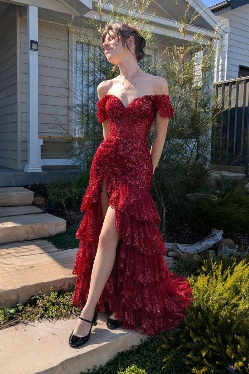 Step into the spotlight with this Off-Shoulder Ruffled Lace A-Line Evening Gown. Adorned with intricate lace appliqués and sparkling sequins, this dress features a romantic off-shoulder neckline and a flowing A-line silhouette with dramatic ruffled layers. A bold high slit ensures graceful movement, while the corset back allows for a customized, flattering fit.