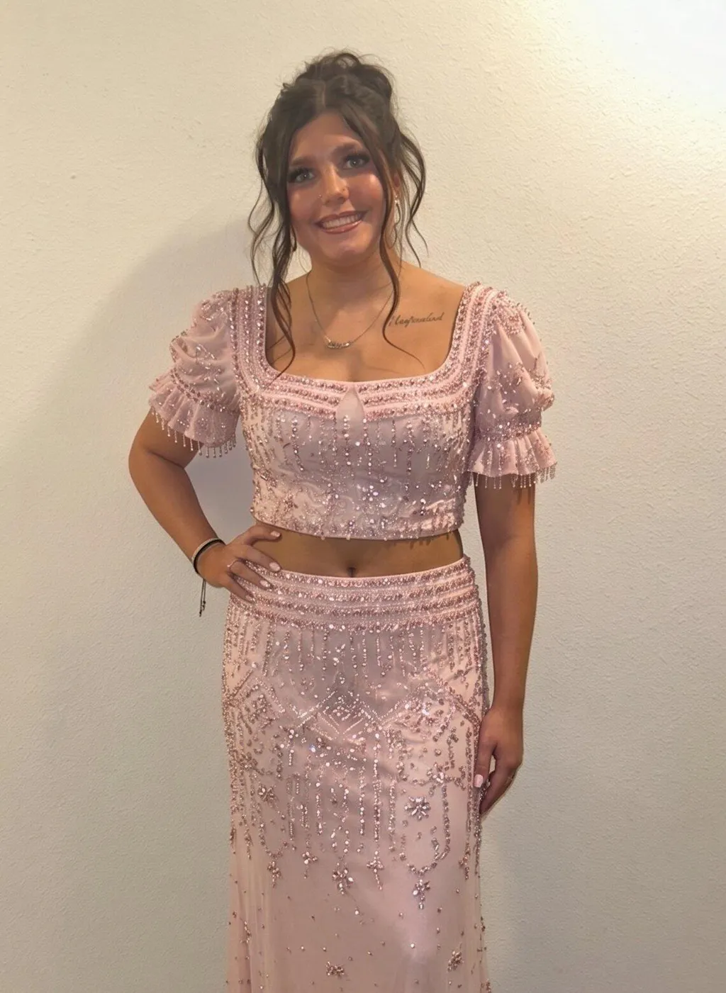 Elevate your formal elegance with this Blush Pink Sequined Two-Piece Square Neck Puff Sleeve Mermaid Evening Gown. Crafted from all-over sequined mesh, this set features a structured square neck crop top with playful short puff sleeves, paired with a figure-hugging mermaid skirt that flares at the hem for a dramatic floor-length silhouette.