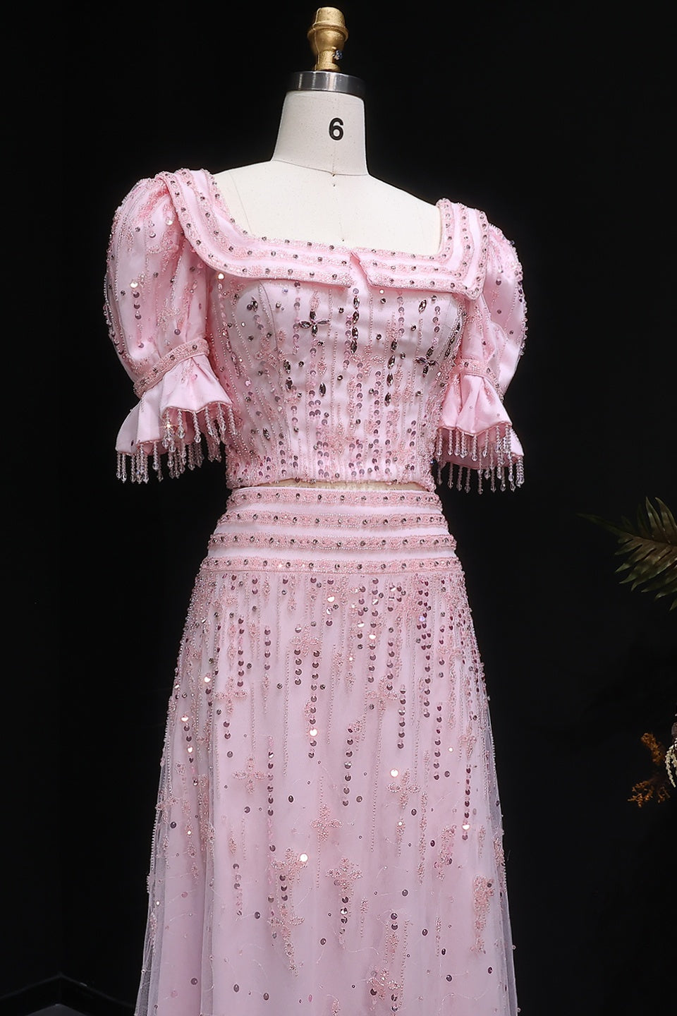 Pink Sequined Two-Piece Square Neck Puff Sleeve Mermaid Evening Dress SS548