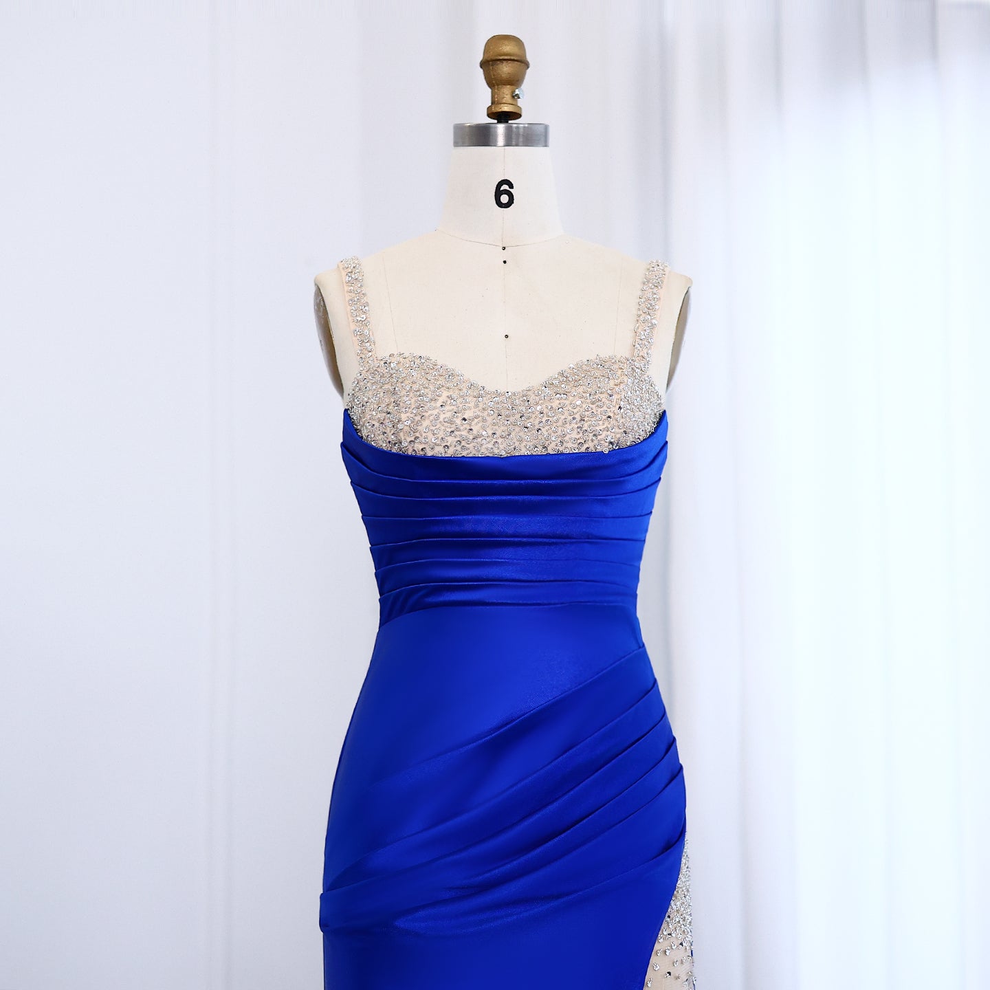 Royal Satin Rhinestone Strap High Slit Evening Prom Dress SH010
