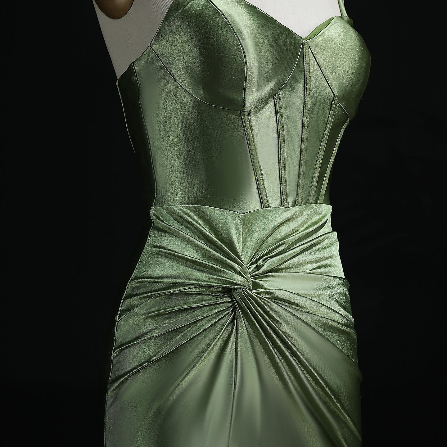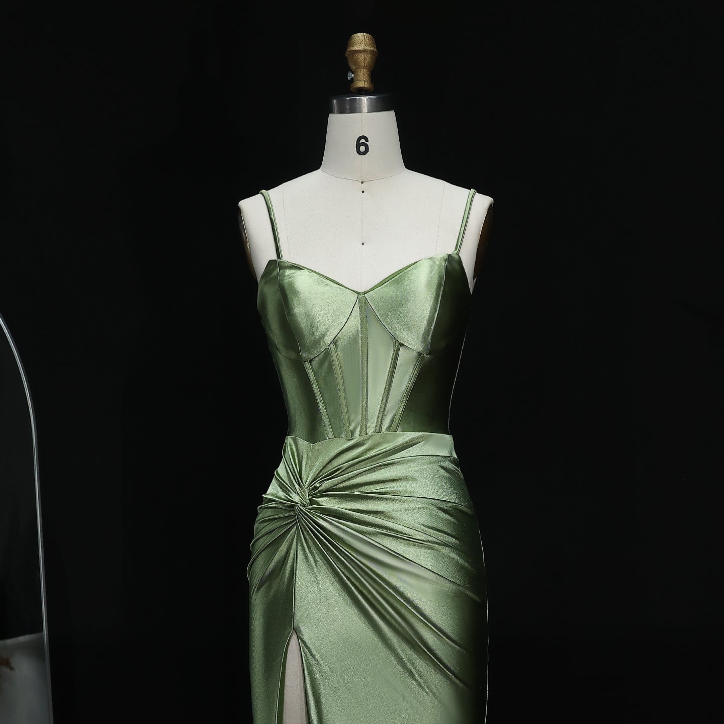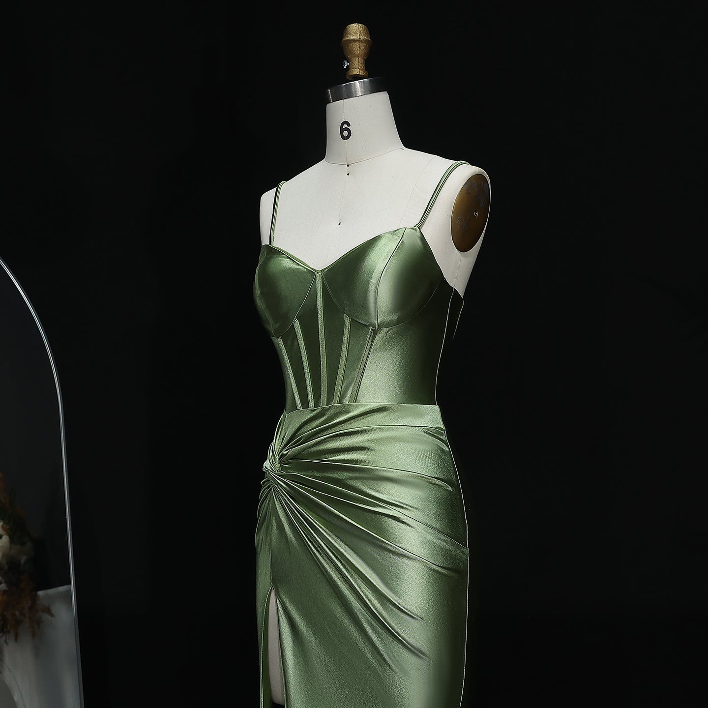 This elegant green satin gown showcases a sweetheart neckline and intricate ruching, combined with a daring side slit for a touch of glam. Perfect for special occasions, it promises to make you stand out in style and sophistication.