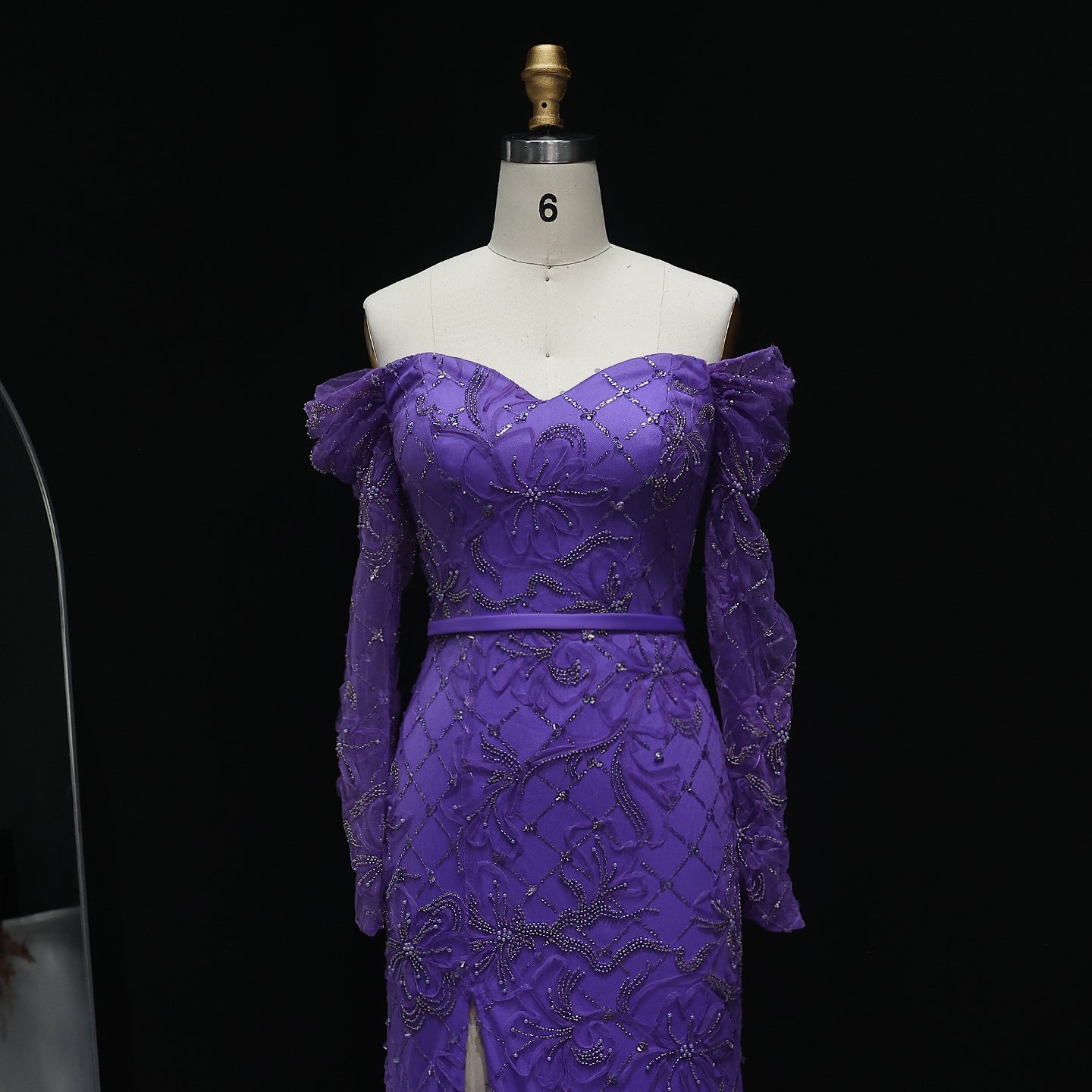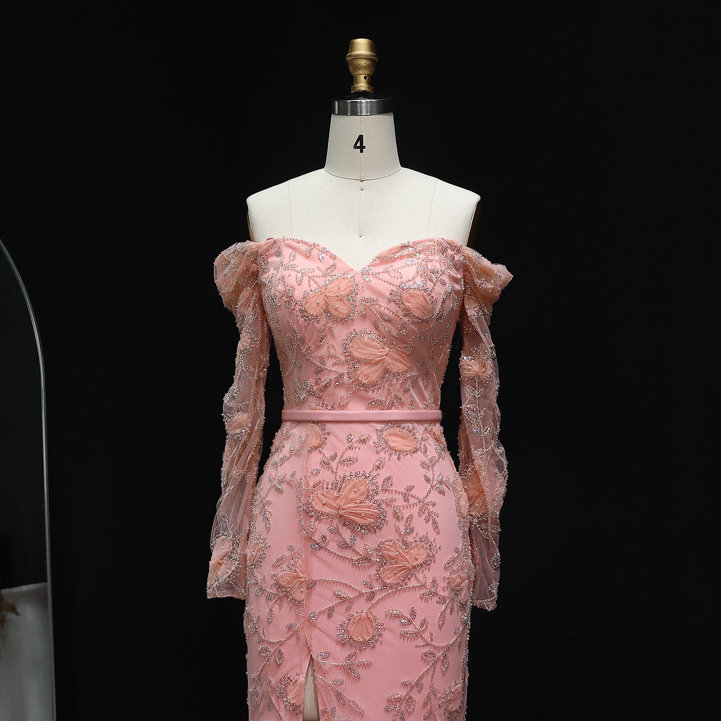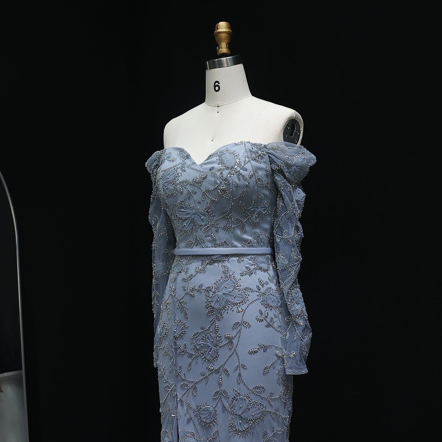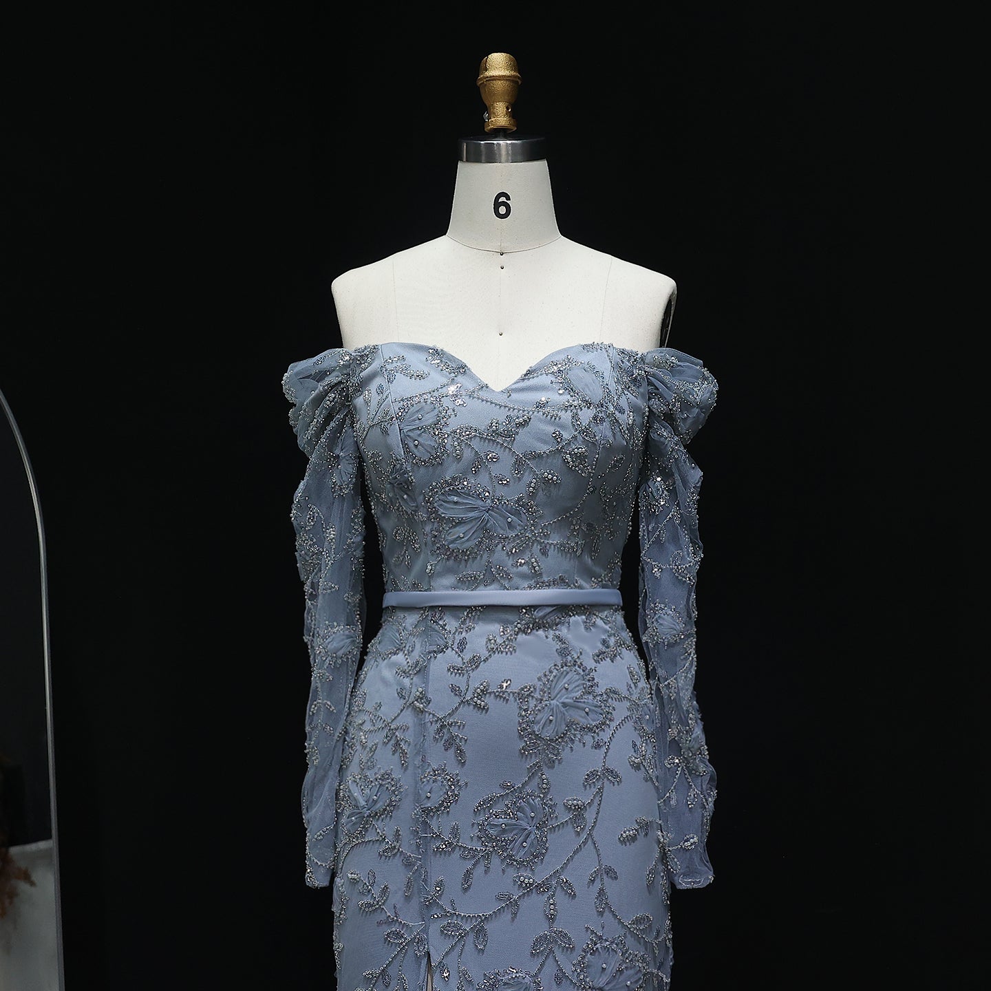 Exude timeless beauty in this ethereal mint green gown. The off-shoulder design and delicate embellishments create a romantic silhouette. A subtle slit adds a modern touch. Ideal for proms, galas, or a sophisticated evening affair.