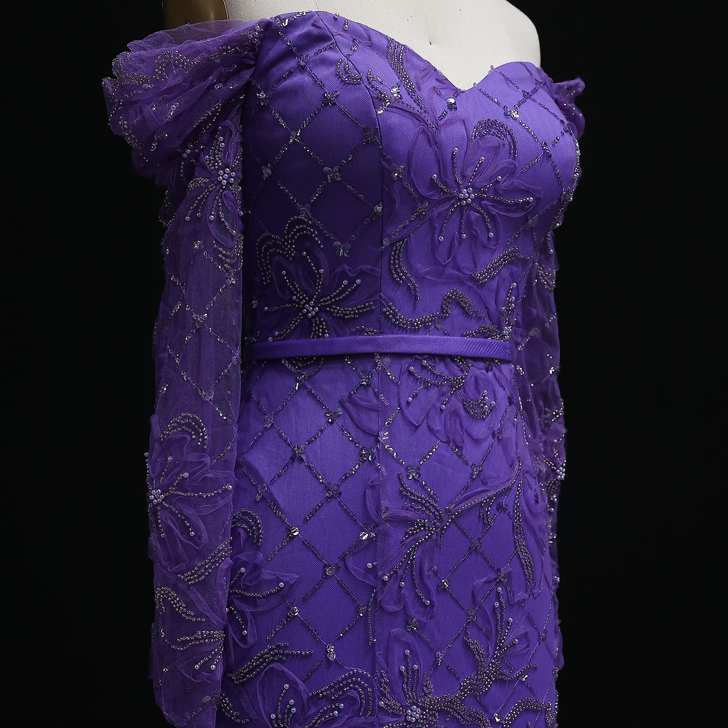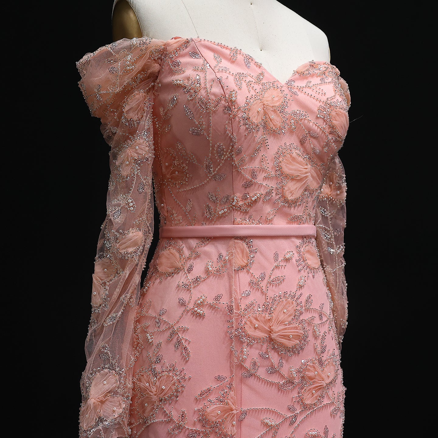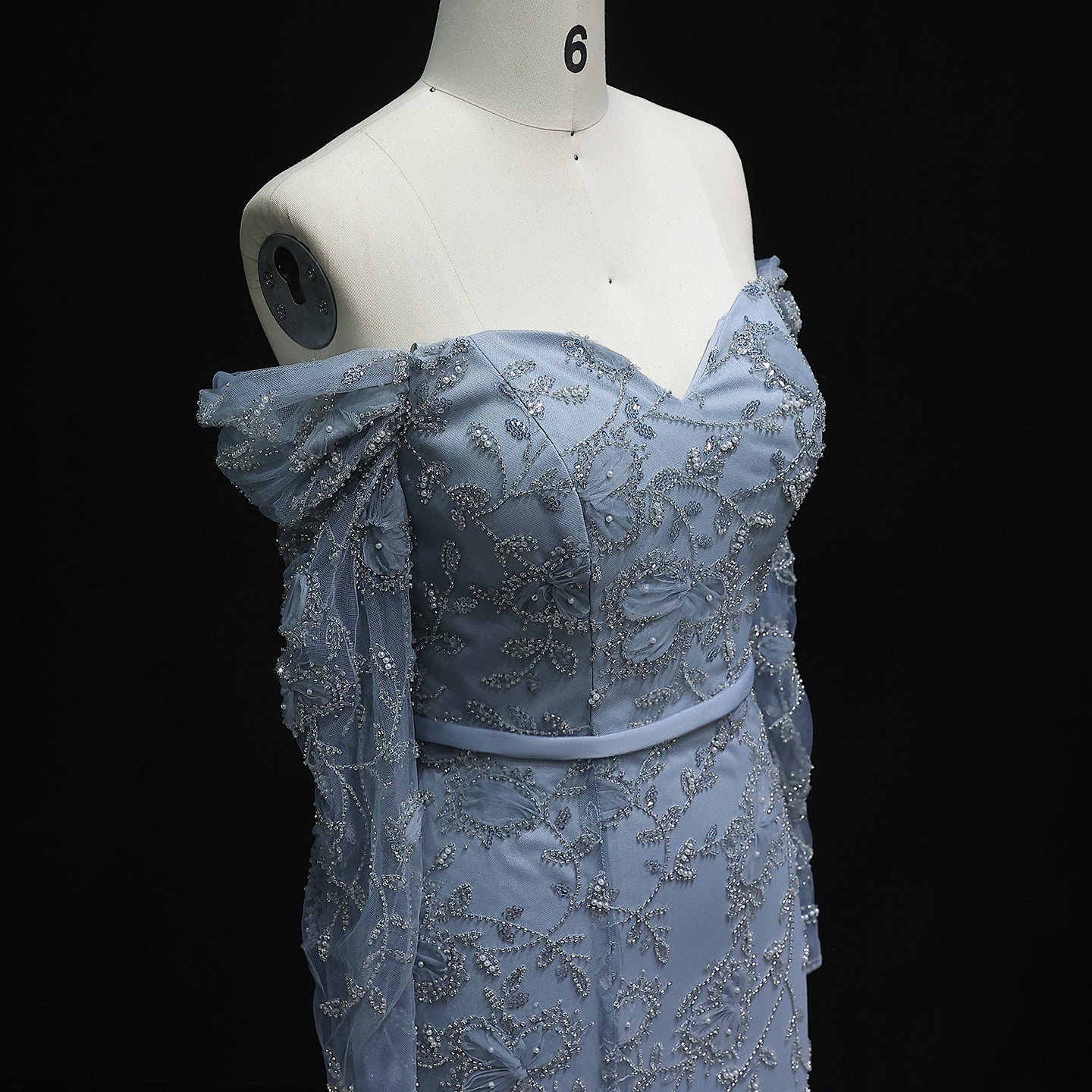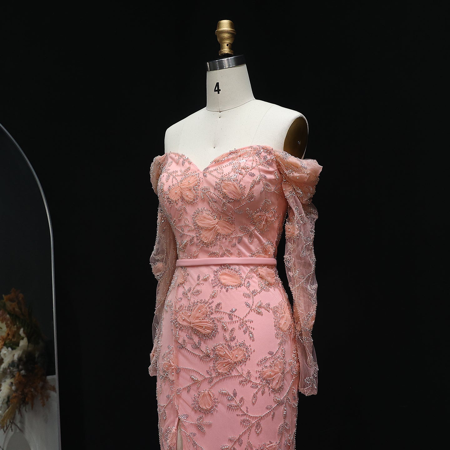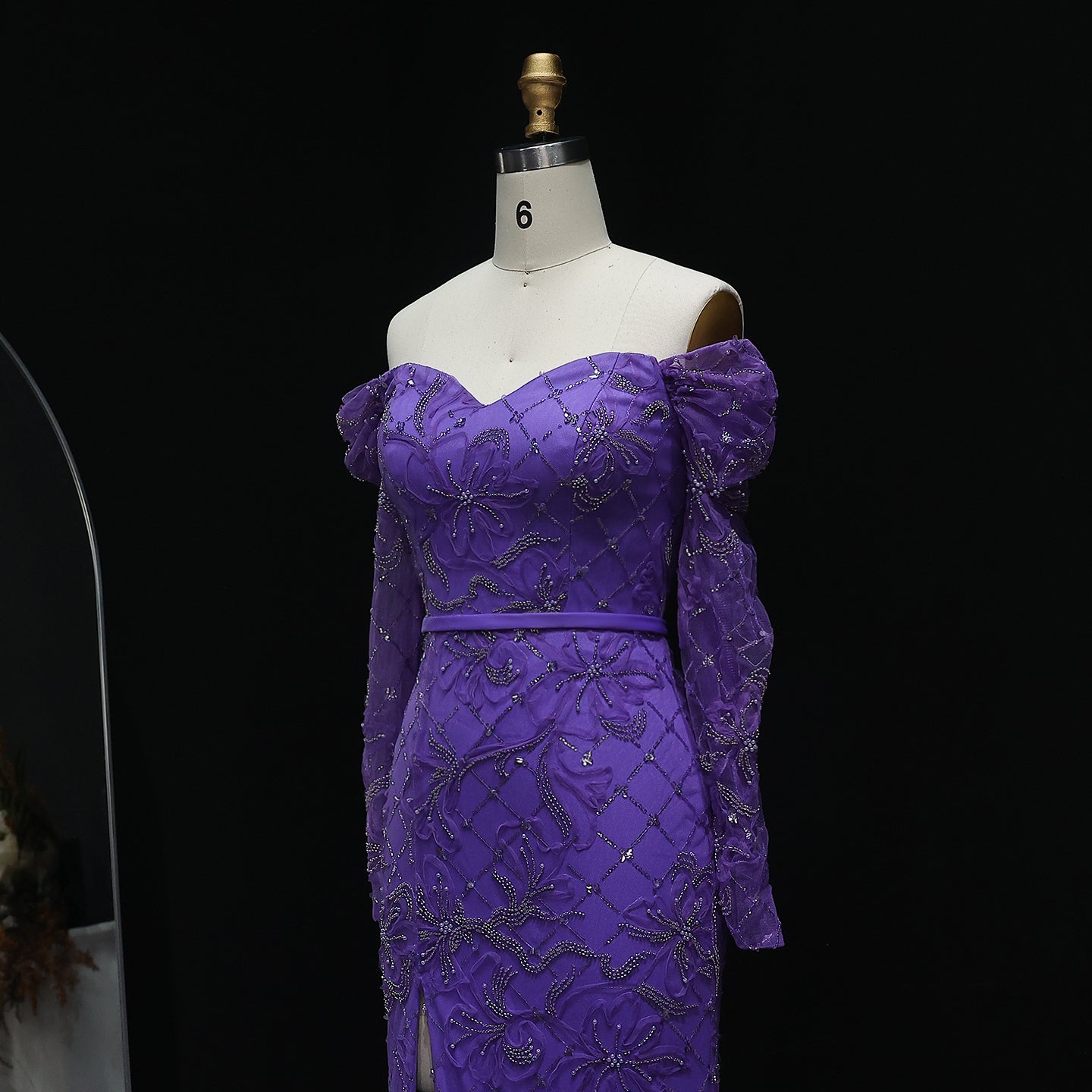 Exude timeless beauty in this ethereal mint green gown. The off-shoulder design and delicate embellishments create a romantic silhouette. A subtle slit adds a modern touch. Ideal for proms, galas, or a sophisticated evening affair.