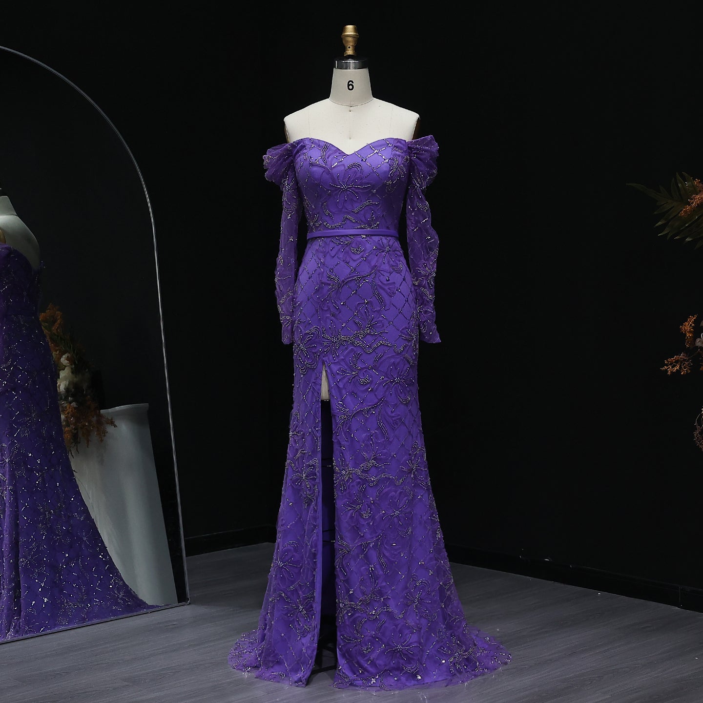 Elegant Off Shoulder Mermaid Green Prom Dresses with Long Sleeve Slit Floral Evening Party Gowns