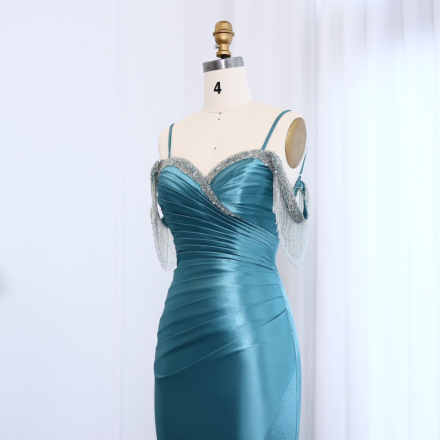 Teal Satin Rhinestone Fringe Strap Mermaid Evening Gown SH011